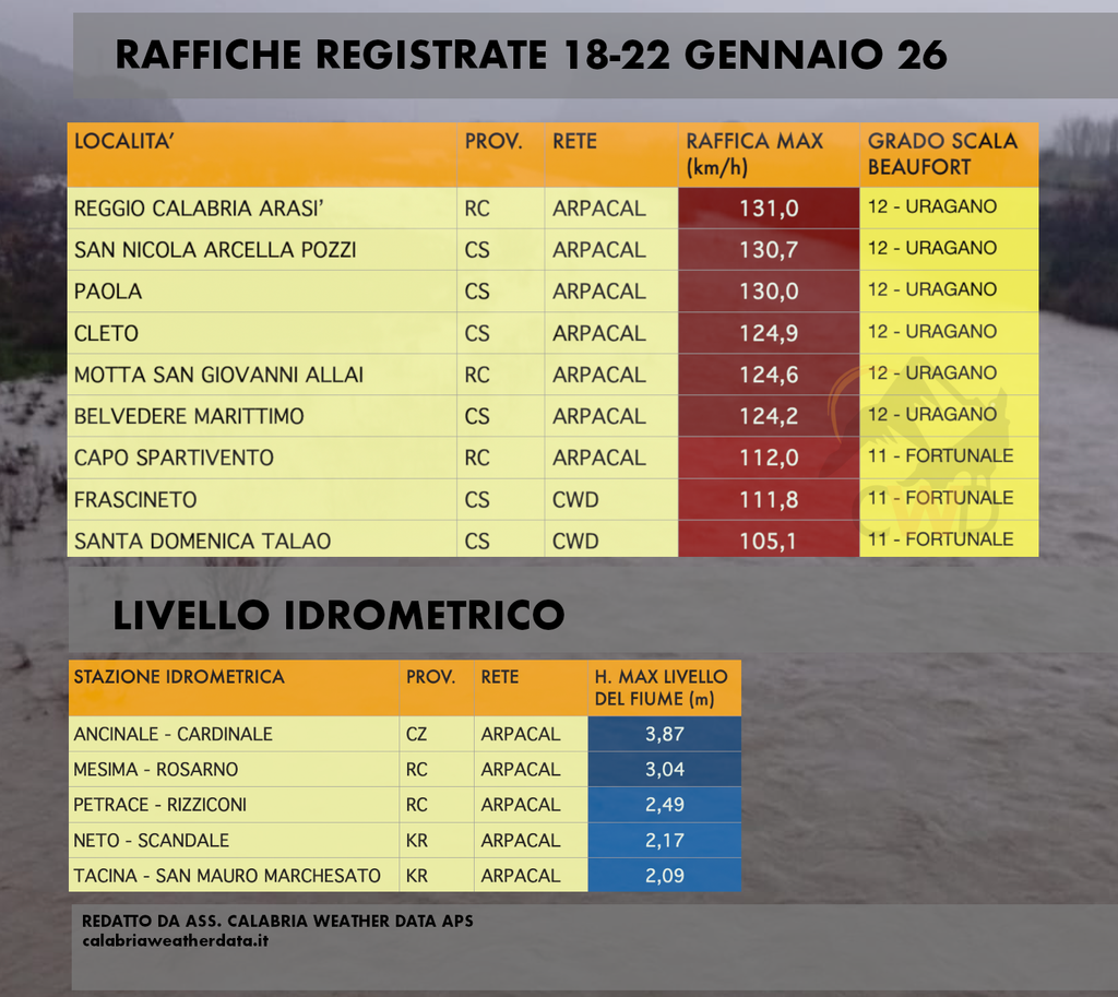 Vi lasciamo al seguito tutto il materiale grafico che riassume la top delle raffiche più intense e picco di piena delle principali aste fluviali calabresi.
