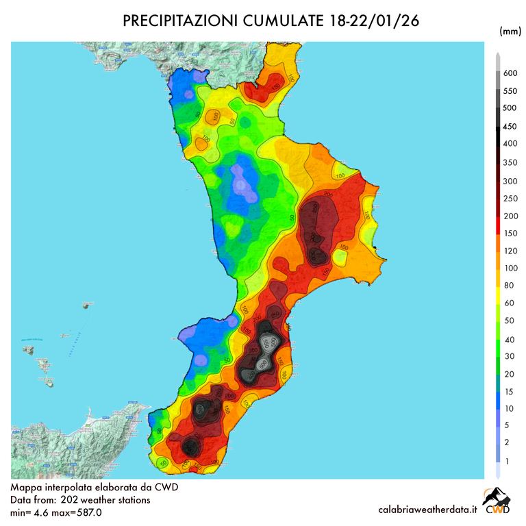 In generale, vaste porzioni del versante ionico hanno ricevuto oltre 150 mm, accumulando così in appena 96 ore quantitativi che rappresentano tra il 20 e il 30% della media annua, localmente fin verso il 40% come nel caso di Roccaforte del Greco.