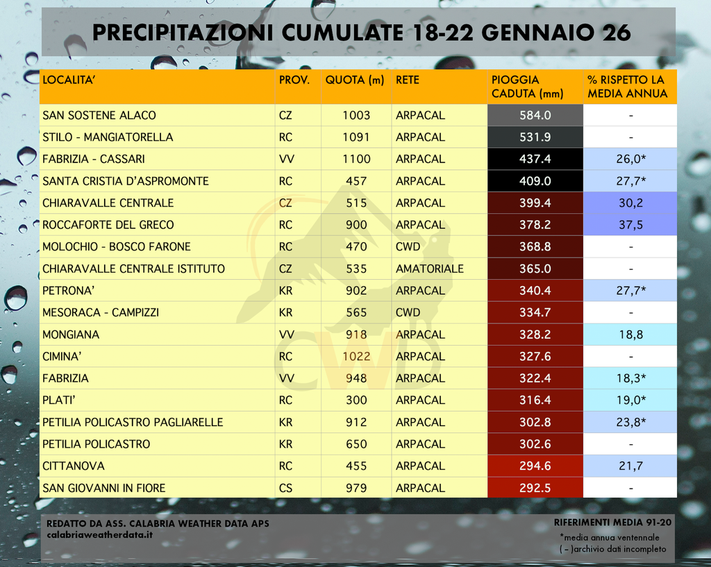 A fine evento è emerso il quadro rappresentato sia nella mappa da noi interpolata che nella tabella dei maggiori quantitativi di pioggia: punte di quasi 600 mm totali sulle Serre (584 presso la diga sull’Alaco, nel territorio di S. Sostene), di oltre 400 mm a ridosso dell’Aspromonte (409 presso S. Cristina) e oltre 300 mm registrati tra Sila Piccola orientale e Sila crotonese: su questi ultimi due settori c’è però da tenere conto dei grandi quantitativi di neve caduti oltre i 1300 metri e che solo giorno dopo giorno, sciogliendosi, stanno venendo registrati dai pluviometri.